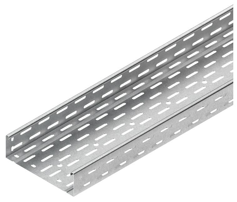 Kabelrinne nach DIN EN 61537, mit versetzt angeordneter Boden- und Seitenperforation, durchgängige Sicken im Boden sorgen durch Verrastung der schraubenlosen Verbinder RVC 60 mit den Seitenholmen für eine schnelle formschlüssige Längsverbindung, bandverzinkt nach DIN EN 10346, einschließlich zwei schraubenlose Verbinder RVC 60.