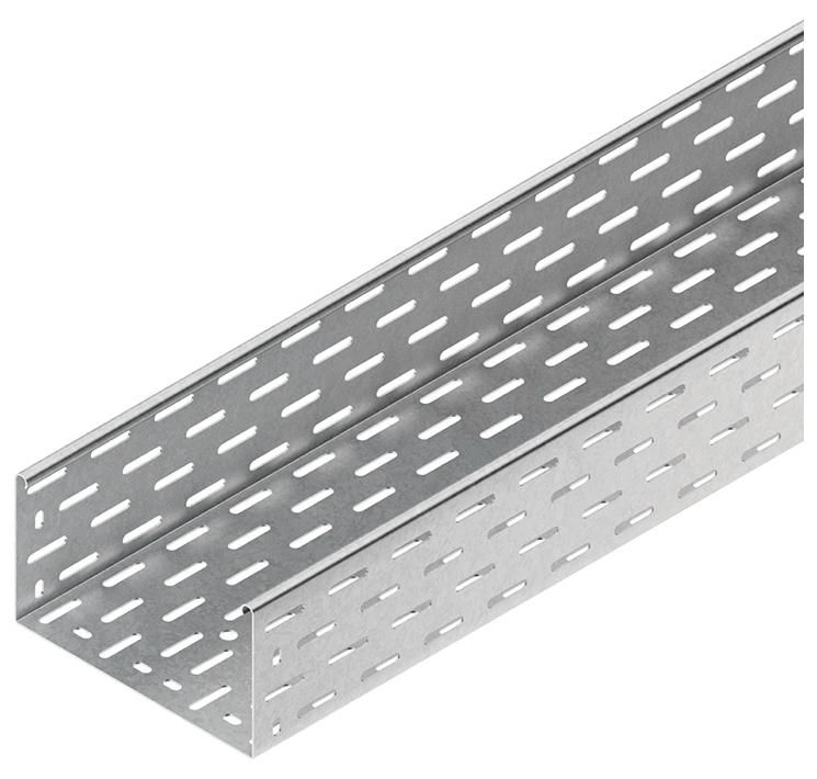 Kabelrinne nach DIN EN 61537, schwer, mit versetzt angeordneter Boden- und Seitenperforation, bandverzinkt nach DIN EN 10346, einschließlich einstückigem U-förmigen Stoßstellenverbinder RV 110... und anteilmäßigem Befestigungszubehör.
