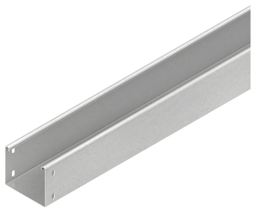 Kabelrinne nach DIN EN 61537, ungelocht, mit Verbinderlochung für den Anschluss, bandverzinkt nach DIN EN 10346, einschließlich einstückigem U-förmigen Stoßstellenverbinder RV 85... und anteilmäßigem Befestigungszubehör.