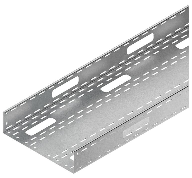 Verteilerkabelrinne nach DIN EN 61537, mit versetzt angeordneter Seiten- und Bodenperforation sowie mit Kabelauslässen von 40 x 150 mm, tauchfeuerverzinkt nach DIN EN ISO 1461, einschließlich tauchfeuerverzinkten einstückigem U-förmigen Stoßstellenverbinder RV 110...F und tauchfeuerverzinkten anteilmäßigem Befestigungszubehör.