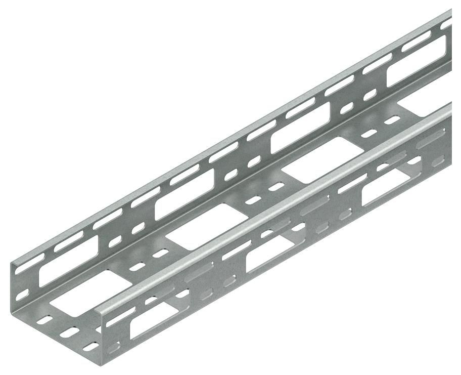 Verteilerkabelrinne nach DIN EN 61537, mit versetzt angeordneter Seiten- und Bodenperforation sowie mit Kabelauslässen im Boden von 30 x 65 mm und in den Seiten von 20 x 65 mm, bandverzinkt nach DIN EN 10346, 2 Stoßstellenverbinder RVV 50 je Stoßstelle bitte gesondert bestellen.