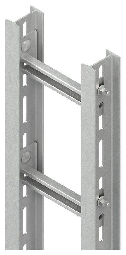 Steigetrasse nach DIN EN 61537, schwere Ausführung, bestehend aus warmgewalzten durchgehend perforierten Profilen I 80 nach DIN 1025 und zwanzig einschraubbaren C-Profil Sprossen 2986 mit 18 mm Schlitzweite nach DIN EN 60715, tauchfeuerverzinkt nach DIN EN ISO 1461, einschließlich tauchfeuerverzinkten anteilmäßigem Befestigungszubehör. Die durchgehende Perforation der Seitenholme ermöglicht den Einbau zusätzlicher Sprossen, beispielsweise wechselseitig, für beidseitige Belegung. Die Lieferung erfolgt aus transporttechnischen Gründen als Bausatz. Passend für Bügelschellen System BU... und BUK.... Zur Verwendung im Funktionserhalt bitte Zusatzvorschriften beachten!