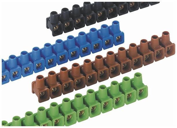Klemmen Messing, Schrauben Stahl, galvanisch verzinkt und transparent passiviert, 12-polige, in Einzelklemmen abtrennbare Leiste, beidseitig offen.
