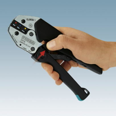 Quetschzange für Kabelschuhe und VerbinderSie entriegelt, sobald der erforderliche Pressdruck erreicht ist, somit sind Unterpressungen ausgeschlossen.