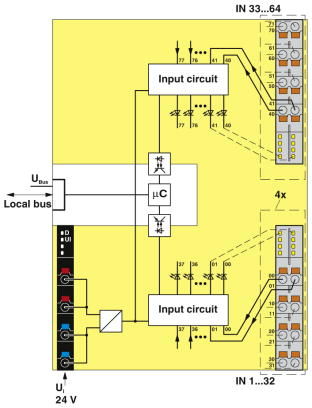 64 digitale Eingänge gemäß EN 61131-2 Typ 1 und Typ 324 V DC, 2,4 mA