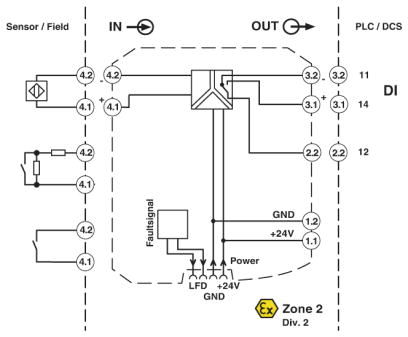Energieversorgung und Fehlermeldung über Tragschienen-Busverbinder möglichInstallation in Zone 2, Zündschutzart "n" (EN 60079-15) zulässig