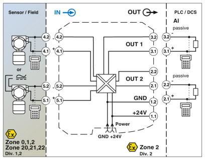 Zwei galvanisch getrennte Ausgänge 0/4 mA ... 20 mA (aktiv)Bidirektionale HART-Übertragung (beide Ausgänge)