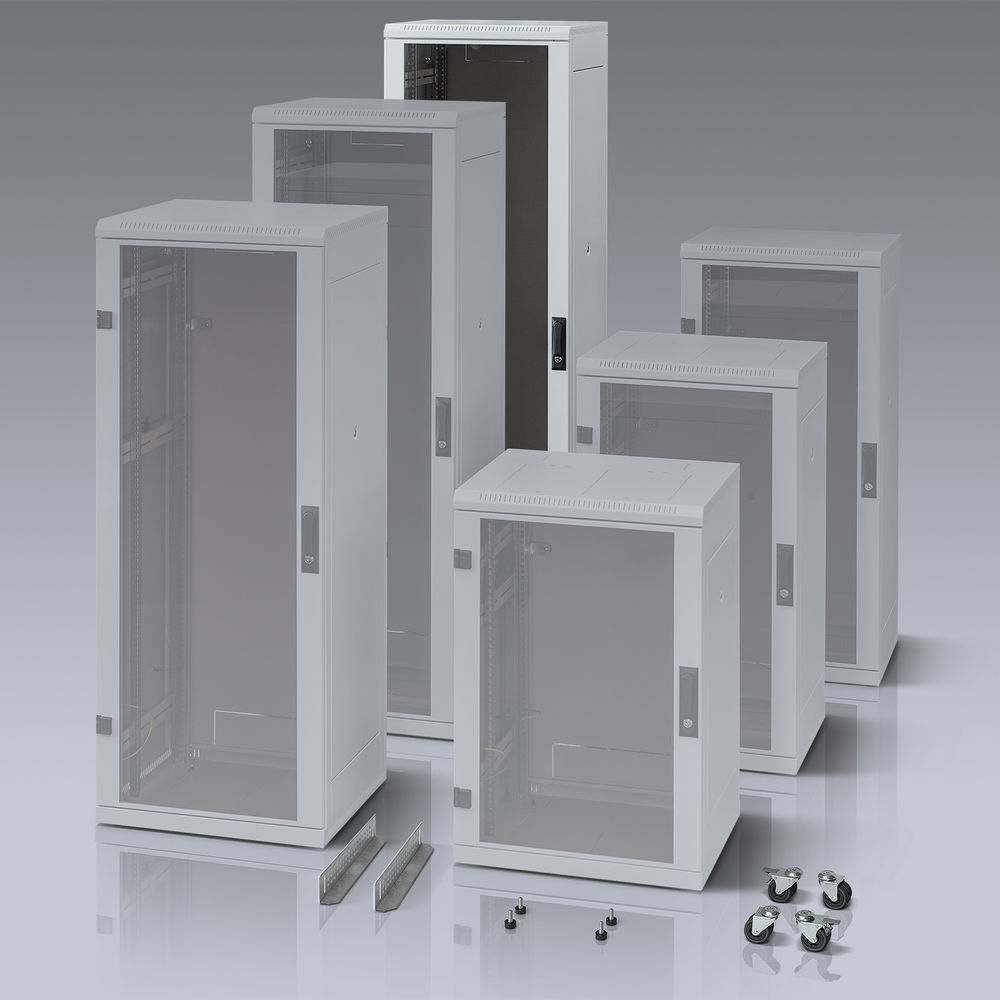 Wie alle Schränke der Serie entspricht auch der RVP-042 den Anforderungen der DIN 41494 für 19˝ Technik. Die robuste Konstruktion aus verschweißtem, pulverbeschichtetem Stahlblech garantiert Langlebigkeit und Stabilität. Eine abschließbare Plexiglastür, stufenlos verstellbare Rasterschienen, abnehmbare Seitenwände sowie umfangreiches Zubehör ermöglichen eine einfache und flexible Integration verschiedenster Komponenten.