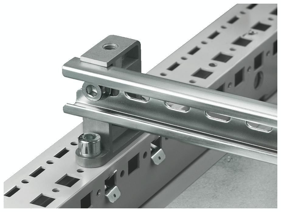 Einbaumöglichkeiten: Am vertikalen TS, SE Schrankprofil über Aufrastmutter TS 8800.808 oder Adapterschiene für PS-Kompatibilität.