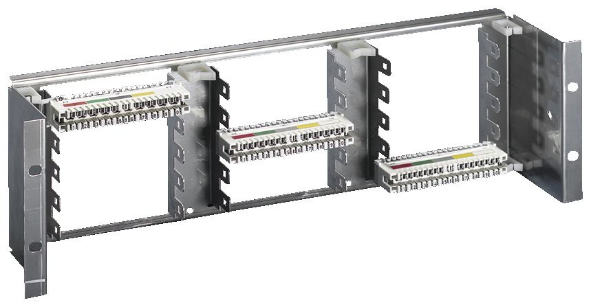 Beschreibung: Zur Aufnahme von maximal 15 LSA-Plus-Leisten (à 10 DA). Es lassen sich 3 x 5 LSA-Plus- Anschlussleisten 2/10, Baureihe 2 waagerecht montieren. Leistenlänge 124 mm, Höhenraster 22,5 mm. Die Trägereinheit lässt sich in alle 482,6 mm (19?)-Befestigungsebenen integrieren. Die Montagefront ist 75 mm hinter den 19?- Flanschen. Die integrierten Rangierbügel ermöglichen ein geordnetes Führen und Verteilen der Fernmeldekabel.
