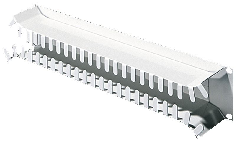 Beschreibung: Zur Aufnahme von LWL- und Kupferleitung. Vom Patch-Panel abgehende Fasern werden durch die Durchlässe in die Wanne gelegt und können seitlich verteilt werden. Abgerundete Öffnungen schützen den Kabelmantel.