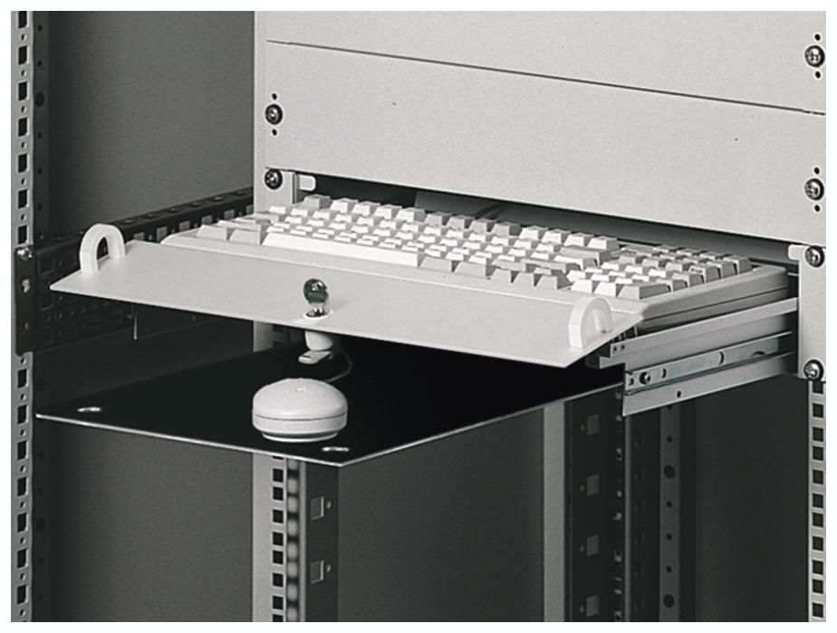 Beschreibung: Für Tastaturen bis 430 mm Breite und 250 mm Tiefe bei umgeklappter Frontplatte.