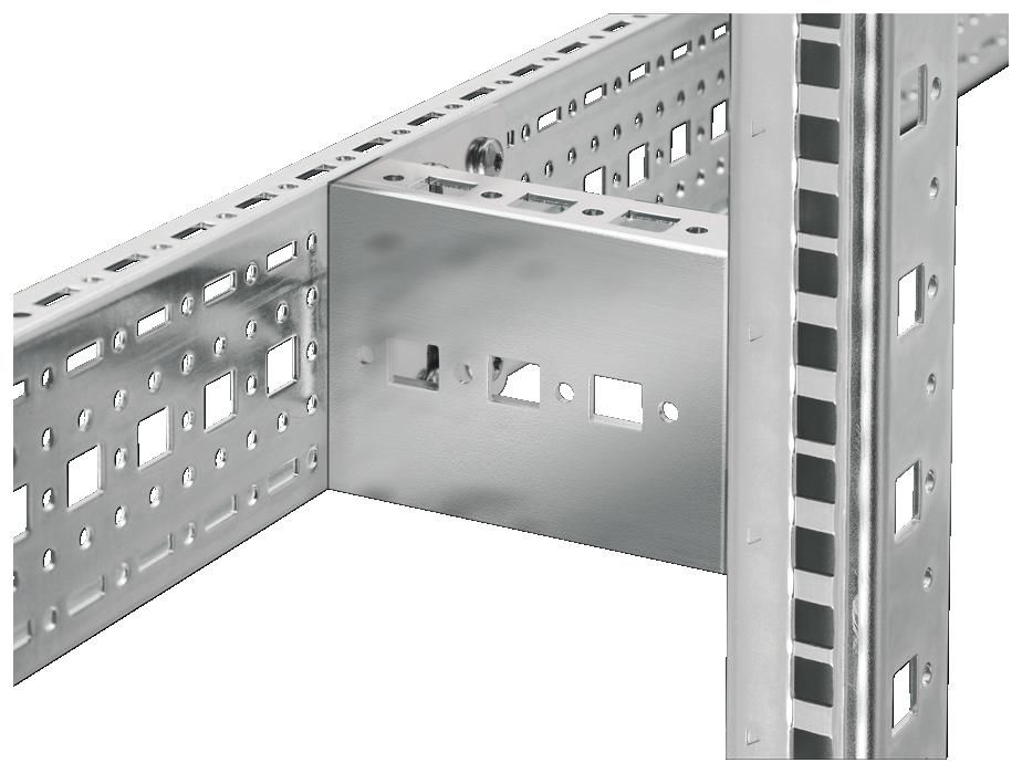 Beschreibung: Die Zusatzbefestigung wirkt einer Verwindung der an Einbauwinkeln montierten Profilschienen bei ungleich verteilter Last entgegen. Sie wird direkt an 482,6 mm (48,3 cm ( 19 Zoll ))-Profilschienen und an den in der Tiefe montierten System-Chassis (innere Ebene) befestigt.