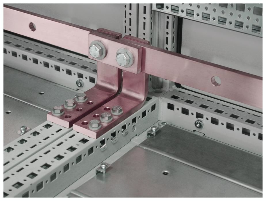 Nutzen: Durch die vorgefertigten Kombiwinkel, Anreihlaschen und die individuell auf Schrankbreite zugeschnittenen Sammelschienen ist eine sehr zeit- und kostensparende Montage möglich