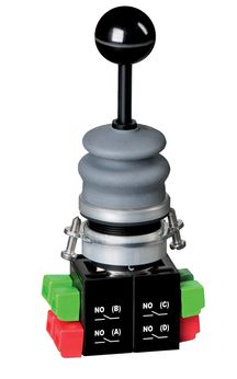 The WKSC52 is a durable four-way switch designed for industrial applications, ensuring safe control of machines and processes. It features four independent directions (left, right, up, down), each with a NO contact. The anodized aluminum front ring and rubber sealing bellow provide a high protection rating of IP65 and IP65, making the switch suitable for both indoor and outdoor environments. With a latching mechanism and creeping contact operation, the switch guarantees precise and reliable switching even during intensive use, with a mechanical lifespan of at least 1,000,000 operations.