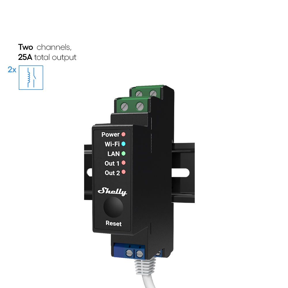 Shelly Pro 2PM hat eine Gesamtgeräteleistung von 25 A.