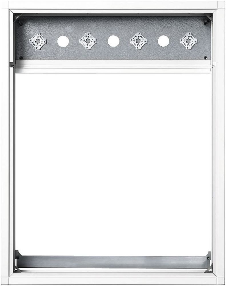 Modul-Gehäuse zur Aufnahme von einem Briefkasten- oder Ablagefachmodul und einem Montagerahmen MR 611-4/1-0 für Funktionsmodule bzw. Infoschild-Modul oder Flächenleuchte im oberen Teil. Dem Adapter liegt das erforderliche Zubehör zur Montage auf dem bestehenden Unterputz-Gehäuse bei. Durch das vergrößerte Aufnahmevolumen des Briefkastens trägt der Rahmen ca. 50 mm auf der Wand auf.