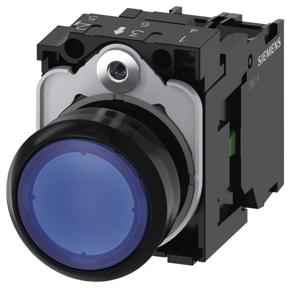 Der Artikel Siemens 3SU11020AB501BA0 Drucktaster beleuchtet 22mm rund blau Knopf 1S AC/DC 24V ist derzeit auf Lager
