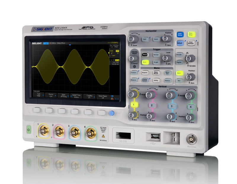 Das SDS2354X Plus Oszilloskop von Siglent überzeugt durch leistungsstarke Hardware und einer Vielzahl an Funktionen. Dieses Model bietet eine Bandbreite von 350 MHz, sowie 4 analoge und 16 digitale Kanäle Mixed-Signal-Analysefähigkeit. Das SDS2354X hat eine maximale Abtastrate von 2 GSa/s und eine maximale Aufzeichnungslänge von 200 Mpts/Kanal.Features Verfügbare Bandbreiten: 350 MHz, 200 MHz und 100 MHz Echtzeit-Abtastrate von bis zu 2 GSa / s. Für 350-MHz-Modelle ist eine Upgrade-Option für die Bandbreite von 500 MHz verfügbar. SPO-Technologie Signal-Erfassungsraten bis zu 120.000 wfm / s (normaler Modus) und 500.000 wfm / s (Sequenzmodus) Unterstützt Intensitätsabstufungs- und Farbtemperatur-Anzeigemodi mit 256 Stufen Aufzeichnungslänge bis zu 200 Mpts / Kanal, insgesamt 400 Mpts für alle 4 Kanäle Digitales Triggersystem Intelligenter Auslöser: Edge, Slope, Impuls, Fenster, Runt, Intervall, Ausfall, Muster und Video (HDTV unterstützt). Die Triggerzone vereinfacht die erweiterte Triggerung Serielle Busauslösung und -decoder, unterstützt die Protokolle I 2 C, SPI, UART, CAN, LIN (Standard) und CAN FD, FlexRay, I 2 S und MIL-STD-1553B (optional) Geringes Hintergrundrauschen mit Spannungsskalen von 0,5 mV / Div bis 10 V / Div Der 10-Bit-Modus bietet eine höhere Auflösung und ein geringeres Rauschen Segmentierter Erfassungsmodus (Sequenzmodus), bei dem die maximale Datensatzlänge gemäß den vom Benutzer festgelegten Triggerbedingungen in mehrere Segmente (bis zu 90.000) unterteilt wird, wobei zwischen den Segmenten eine sehr kurze Totzeit für die Erfassung des qualifizierenden Ereignisses liegt Verlaufswellenformaufzeichnungsfunktion (Verlauf) für bis zu 90.000 ausgelöste Wellenformen (Frames) Automatische Messfunktion für mehr als 50 Parameter, unterstützt Statistiken mit Histogramm und Trend Zwei mathematische Spuren unterstützen 2 Mpts FFT, +, -, x, ÷, d / dt, ∫dt, √, Durchschnitt, ERES und Formeleditor Zahlreiche Datenverarbeitungs- und Analysefunktionen wie Suchen, Navigieren, Maskentest, Bode-Plot, Leistungsanalyse (optional) und Zähler 16 digitale Kanäle (optional) Eingebauter 50 MHz Wellenformgenerator (optional) Großes 10,1-Zoll-TFT-LCD-Display mit einer Auflösung von 1024 × 600 Der kapazitive Touchscreen unterstützt Multi-Touch-Gesten Mehrere Schnittstellen: USB-Host, USB-Gerät (USBTMC), LAN (VXI-11 / Telnet / Socket), Pass / Fail, Trigger Out Der integrierte Webserver unterstützt die Fernsteuerung über den LAN-Port mithilfe eines Webbrowsers. Unterstützt SCPI-Fernbedienungsbefehle Technische Daten Gerätespezifikation
