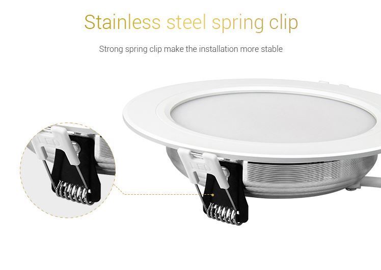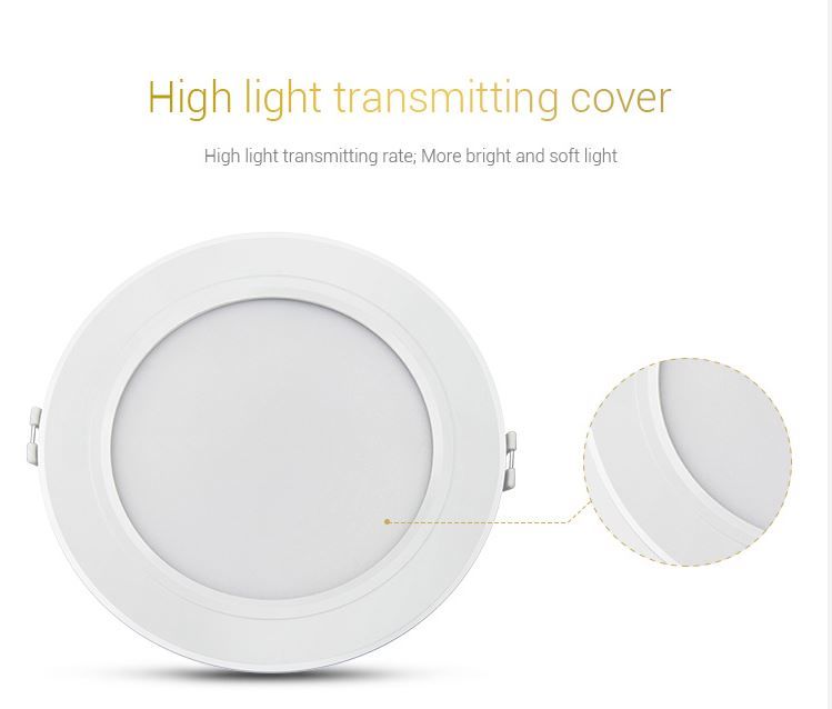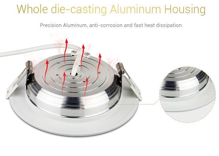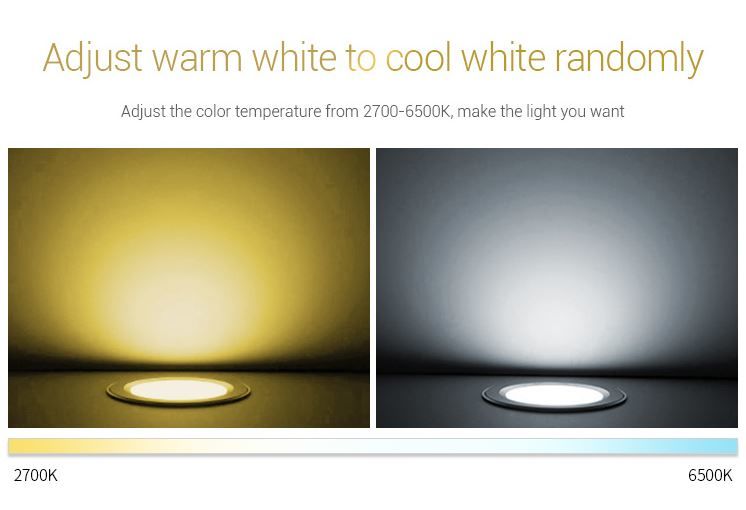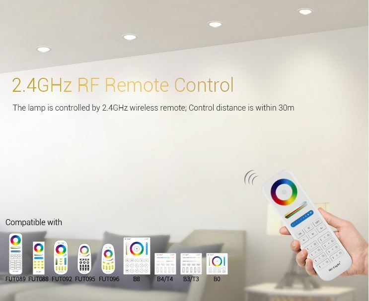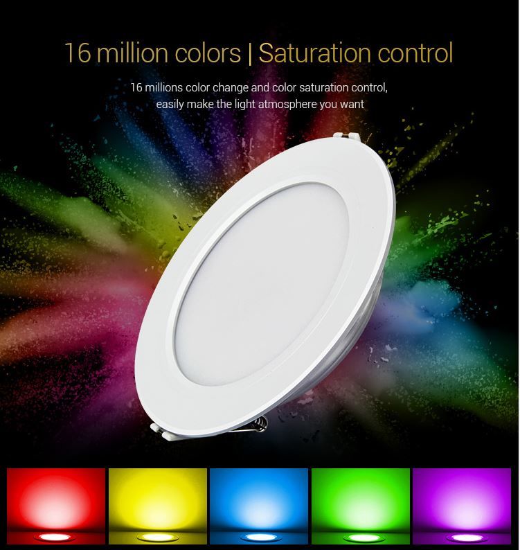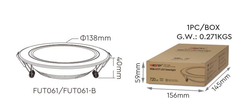 Product Name: 9W RGB+CCT LED Downlight Model No.: FUT061 Power: 9W Input Voltage: AC100~240V 50/60Hz Color temperature: 2700K~6500K Luminous Flux: 720LM Light Efficiency: 80LM/W CRI:>80 PF: >0.5 Lifespan: 50000 hours Beam Angle: 120° Control Distance:30m HoIe Size: ø110~125mm MateriaI: AIuminum
