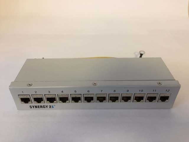 Patch Panel 12xTP, CAT6A, incl.Keystone, Slim-line mit Kabelklemme, Aufputz Metall, Lichtgrau, Synergy 21,