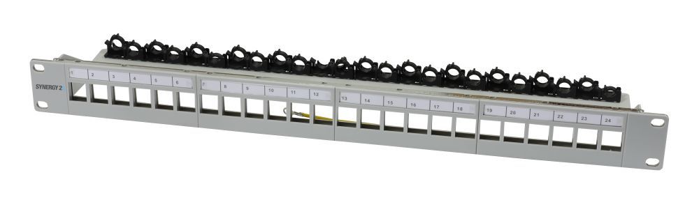 Patch Panel 24xTP,CAT6A, incl.Keystone Slim-line mit Kabelklemme, 48,3 cm ( 19 Zoll ), 1HE(t 94mm) mit Kabelklemme, Lichtgrau, Synergy 21,