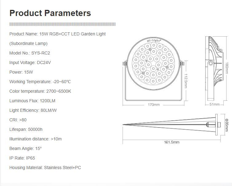 Product Name: 9W RGB+CCT LED Garden Light (Subordinate Lamp) Model No.: SYS-RC1 Input Voltage: DC24V Power: 9W Working Temperature: -20~60° Color temperature: 2700~6500K Luminous Flux: 700LM Light ...Lieske-Nr.: 1375987 Hersteller-Nr.: SYS-RC1 |