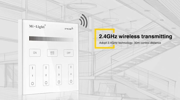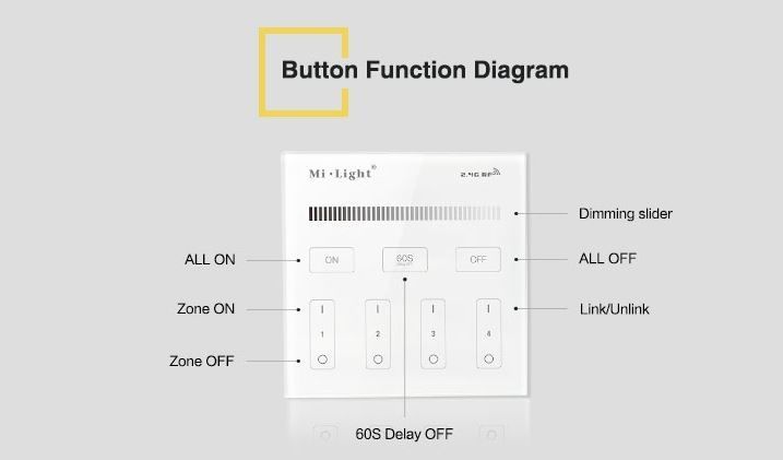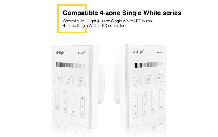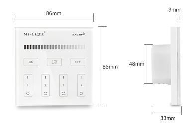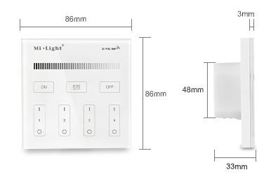 Product Name: 4-Zone Brightness Dimming Smart Panel Remote Controller Model No.: T1 Working Temperature: -20 -60° Voltage: AC90~110V or AC180~240V Transmission Frequency: 2400-2483.5MHz Modulation Method: GFSK Transmitting Power: 6dBm Control Distance: 30m Panel Size: 86*86mm
