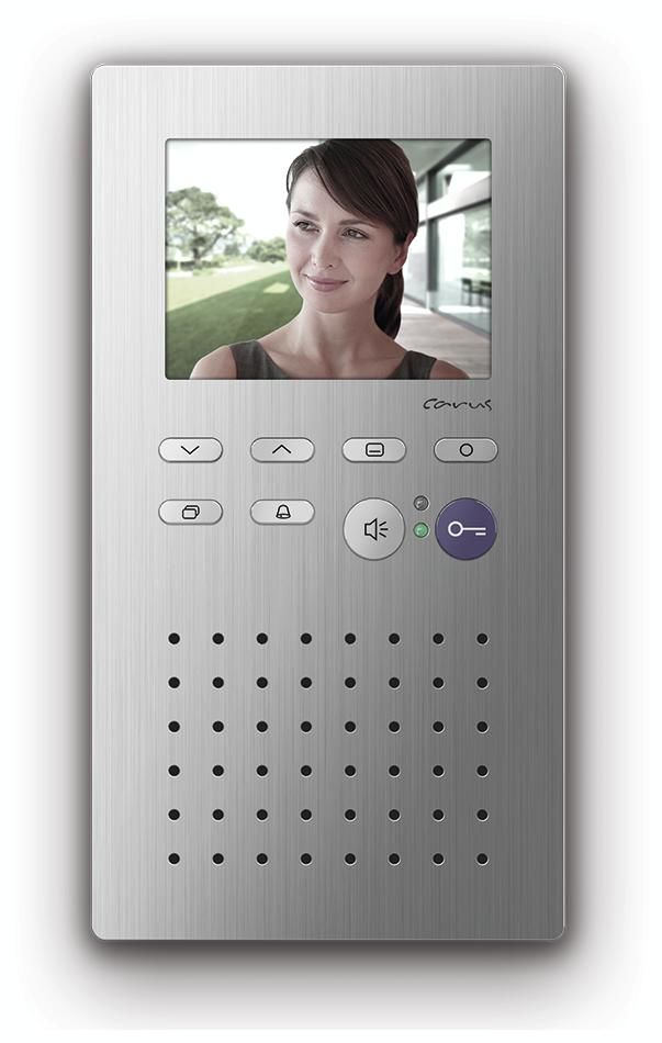 Carus Origo Video-Innenstation, Gehäuse aus massivem Aluminium, handveredelte Strukturoberfläche, Farbe: Silber, Tasten aus poliertem, eloxiertem Aluminium, laserbeschriftet, TFT-Display Bildschirmdiagonale 8,9cm (8,9 cm ( 3,5 Zoll )), Auflösung color: 320 x 240 Pixel, Aufputzmontage, Freisprechen (hands-free) / manuell gesteuertes Wechselsprechen aktivierbar, blaue Türöffnertaste, Taste für Rufannahme bzw. Umschalttaste Sprechen / Hören, wenn Wechselsprechen aktiviert, 1 Funktionstaste mit optischer Anzeige, ab Werk: mit Steuerfunktion belegt aktivierbare Alternativbelegung: Internruf, Türöffnerautomatik, Rufumleitung, Licht / mit configo einstellbar, Bildtaste zum Einschalten des Bildes bzw. zum Umschalten zwischen verschiedenen Kameras, Menütaste zur Aktivierung, Steuerung des OSD Menü, 2 Cursortasten zur OSD Navigation und Einstellung, Auswahl aus 13 polyphonen Ruftönen, über OSD einstellbar, akustische und optische Rufunterscheidung zwischen Haus-, Wohnungstür und Internruf, akustische Türrufunterscheidung je Klingeltaste, 4 unterschiedliche Ruftöne, akustische Türrufunterscheidung für 2 Türen, Ruftonabschaltung mit optischer Anzeige, OSD basierte Auslösung von max. 10 Internrufen und max. 10 Steuerfunktionen mit Bezeichnung / mit configo einstellbar, OSD basierte Bedienung des zentralen Bildspeichers (FVM1000), Ruftonlautstärke in 4 Stufen über OSD einstellbar, Sprechenlautstärke in 8 Stufen über OSD einstellbar, Helligkeit, Kontrast, Farbsättigung über OSD einstellbar, 1 Parallelruf / mit configo aktivierbar, Empfang und Anzeige von max. 10 Kurzmitteilungen, optische Anzeige für neu aufgezeichnete Bilder im zentralen Bildspeicher (FVM1000), optische Kurzzeitspeicherung von Türrufen, optische Besetztanzeige bei bestehender Sprechverbindung, optische Anzeige ungelesener Kurzmitteilungen, Anschluss für Etagentaster am Gerät vorhanden, Mithörsperre und automatische Gesprächsabschaltung, Audio- und Video-Innenstationen sind innerhalb einer Anlage kombinierbar, basiert auf dem TCS-Videosystem in 6-Draht-Technik, Eingangsstrom: I(a) = 0,04 mA, I(P) = 8 mA in Ruhe, maximaler Eingangsstrom: I(Pmax) = 175 mA, zulässige Umgebungstemperatur: -5 Grad C bis 40 Grad C, geprüft nach EN 50486, Gehäusemaß: H 186 mm x B 101 mm x T 20 mm, Montagemaß: H 250 mm x B 101 mm x T 22 mm