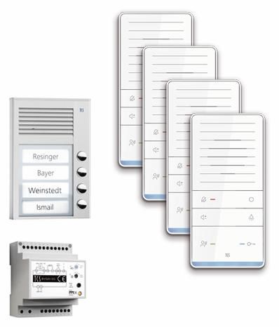 audio:pack PAAF041/001 für 4 WE, Artikelnummer: PAAF041/001, Paketbeschreibung, audio:pack für 4 Wohneinheiten, Innenstation zum Freisprechen, Außenstation zur Aufputzmontage, vorkonfigurierte TCS-Anlagenkomponenten, Lieferumfang, 1x Außenstation PAK03-EN, 4x Freisprecher ISW5031-0145, 1x Steuergerät BVS20-SG, Freisprecher ISW5031-0145, Produktmerkmale, Geräteart: TASTA Freisprecher AUDIO PLUS WS, Kommunikationstechnologie: TCS:BUS und Video-2-Draht:BUS, Montageform: Aufputz-Montage mit TASTA Montageschale AP und über UP-Dose, Tischmontage mit separatem TischZubehör ZIT5000-0030, Anzahl akustischer Rufunterscheidungen: Akustische Rufunterscheidung zwischen 2 Haustür-, Wohnungstür- und Internruf, automatische Gesprächsabschaltung, automatisches Freisprechen nach Internruf: Aktivierbar / deaktivierbar mit configo, Freisprechen (hands-free) / manuell gesteuertes Wechselsprechen aktivierbar, Lauststärke Gespräch: Lautstärketaste zum Einstellen der Sprachlautstärke bei bestehender Sprechverbindung und zum Einstellen der Ruftonlautstärke, wenn keine Sprechverbindung besteht, Sprechenlautstärke in 4 Stufen vom Benutzer einstellbar, Besetztanzeige: Optische Besetztanzeige bei bestehender Sprechverbindung., Mithörsperre, Rufanzeige: Konfigurierbar. Optische Anzeige und Kurzzeitspeicherung von Türrufen, Ruftonabschaltung: Ruf-Aus-Taste zur Ruftonabschaltung mit optischer Anzeige und zum Modus Ruftonauswahl und Anzeige Rufumleitung, Ruftöne: Auswahl aus 13 Ruftönen, vom Benutzer einstellbar. Ruftonlautstärke in 4 Stufen vom Benutzer einstellbar, Internruf (Anzahl konfigurierbar), Anzahl Parallelrufe (Innenstationen pro Türruf): 1 Parallelruf mit configo einstellbar, Etagenruf möglich: Anschluss für Etagentaster am Gerät vorhanden, Lichtschalten: Lichttaste, alternativ zur Ruftonauswahl Etagenruf und (De-)Aktivierung Ambientebeleuchtung, Alternativ programmierbare Steuerfunktion 9 oder Internruf 2, Türöffnen: Türöffnertaste plus optischer Anzeige, alternativ zur Ruftonauswahl Türruf 1 von der Außenstation, mit aktivierbarer Etagentüröffnerfunktion, Türöffnerautomatik, Etagentüröffnerfunktion: de-/aktivierbar mit configo, Fehleranzeige: Akustische und optische Fehleranzeige für zeitsparende Inbetriebnahme, funktional erweiterbar: Seitlicher Einschub mit Funksendeplatine zur Ansteuerung Funksignalgerät, Inbetriebnahme und Konfiguration: Konfigurationssoftware configo zur komfortablen Anlagenkonfiguration am PC mit automatischer Erkennung von Gerätetyp und Seriennummer nutzbar, Montageplatte: Unterschale mit gesteckter Schraubklemme vorinstallierbar, Aktivierung von Zusatzfunktionen: Funktionstaste ab Werk mit Steuerfunktion belegt /aktivierbare Alternativbelegung Internruf, Türöffnerautomatik, Rufumleitung und Ruftonauswahl Internruf / mit configo einstellbar, Ambientebeleuchtung: Als Orientierungslicht, de- bzw. aktivierbar, als Rufanzeige de-/ aktivierbar, LED-Anzeige: Türöffneranzeige LED blau, LED (rot): Ruftonabschaltung aktiv (leuchtet), Rufumleitung aktiv (blitzt), LED (grün): Anruf und Sprechen aktiv (leuchtet), Sprachkanal belegt (blinkt 3x), Technische Daten, Abmessungen HxBxT (mm): 195x94x21, Material / Farbe: Gehäuse aus antistatischem und recycelbarem Kunststoff. Farbe weiß glänzend, UV-