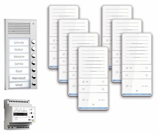 video:pack PAAF071/001 für 7 WE, Artikelnummer: PAAF071/001, Paketbeschreibung, audio:pack für 7 Wohneinheiten, Innenstation zum Freisprechen, Außenstation zur Aufputzmontage, vorkonfigurierte TCS-Anlagenkomponenten, Lieferumfang, 1x Außenstation PAK07-EN, 7x Türtelefon ISW5031-145, 1x Steuergerät BVS20-SG, Freisprecher ISW5031-145, Produktmerkmale, Geräteart: TASTA Freisprecher AUDIO PLUS WS, Kommunikationstechnologie: TCS:BUS und Video-2-Draht:BUS, Montageform: Aufputz-Montage mit TASTA Montageschale AP und über UP-Dose, Tischmontage mit separatem TischZubehör ZIT5000-0030, Anzahl akustischer Rufunterscheidungen: Akustische Rufunterscheidung zwischen 2 Haustür-, Wohnungstür- und Internruf, automatische Gesprächsabschaltung, automatisches Freisprechen nach Internruf: Aktivierbar / deaktivierbar mit configo, Freisprechen (hands-free) / manuell gesteuertes Wechselsprechen aktivierbar, Lauststärke Gespräch: Lautstärketaste zum Einstellen der Sprachlautstärke bei bestehender Sprechverbindung und zum Einstellen der Ruftonlautstärke, wenn keine Sprechverbindung besteht, Sprechenlautstärke in 4 Stufen vom Benutzer einstellbar, Besetztanzeige: Optische Besetztanzeige bei bestehender Sprechverbindung., Mithörsperre, Rufanzeige: Konfigurierbar. Optische Anzeige und Kurzzeitspeicherung von Türrufen, Ruftonabschaltung: Ruf-Aus-Taste zur Ruftonabschaltung mit optischer Anzeige und zum Modus Ruftonauswahl und Anzeige Rufumleitung, Ruftöne: Auswahl aus 13 Ruftönen, vom Benutzer einstellbar. Ruftonlautstärke in 4 Stufen vom Benutzer einstellbar, Internruf (Anzahl konfigurierbar), Anzahl Parallelrufe (Innenstationen pro Türruf): 1 Parallelruf mit configo einstellbar, Etagenruf möglich: Anschluss für Etagentaster am Gerät vorhanden, Lichtschalten: Lichttaste, alternativ zur Ruftonauswahl Etagenruf und (De-)Aktivierung Ambientebeleuchtung, Alternativ programmierbare Steuerfunktion 9 oder Internruf 2, Türöffnen: Türöffnertaste plus optischer Anzeige, alternativ zur Ruftonauswahl Türruf 1 von der Außenstation, mit aktivierbarer Etagentüröffnerfunktion, Türöffnerautomatik, Etagentüröffnerfunktion: de-/aktivierbar mit configo, Fehleranzeige: Akustische und optische Fehleranzeige für zeitsparende Inbetriebnahme, funktional erweiterbar: Seitlicher Einschub mit Funksendeplatine zur Ansteuerung Funksignalgerät, Inbetriebnahme und Konfiguration: Konfigurationssoftware configo zur komfortablen Anlagenkonfiguration am PC mit automatischer Erkennung von Gerätetyp und Seriennummer nutzbar, Montageplatte: Unterschale mit gesteckter Schraubklemme vorinstallierbar, Aktivierung von Zusatzfunktionen: Funktionstaste ab Werk mit Steuerfunktion belegt /aktivierbare Alternativbelegung Internruf, Türöffnerautomatik, Rufumleitung und Ruftonauswahl Internruf / mit configo einstellbar, Ambientebeleuchtung: Als Orientierungslicht, de- bzw. aktivierbar, als Rufanzeige de-/ aktivierbar, LED-Anzeige: Türöffneranzeige LED blau, LED (rot): Ruftonabschaltung aktiv (leuchtet), Rufumleitung aktiv (blitzt), LED (grün): Anruf und Sprechen aktiv (leuchtet), Sprachkanal belegt (blinkt 3x), Technische Daten, Abmessungen HxBxT (mm): 195x94x21, Material / Farbe: Gehäuse aus antistatischem und recycelbarem Kunststoff. Farbe weiß glänzend, UV-
