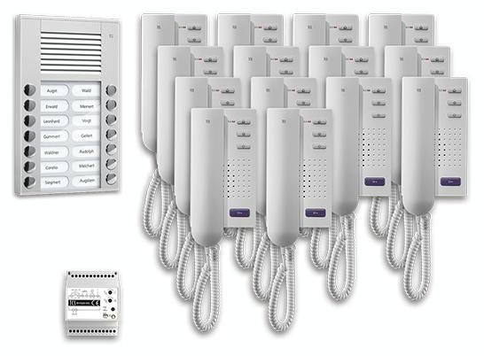 14x Türtelefon 4Tasten WS, Artikelnummer: ISH3030-0140, 1x Vers. + Steuerg. BVS20 1Strang 4TE, Artikelnummer: BVS20-SG, Das Paket ist ab Werk vorkonfiguriert und bedingt erweiterbar