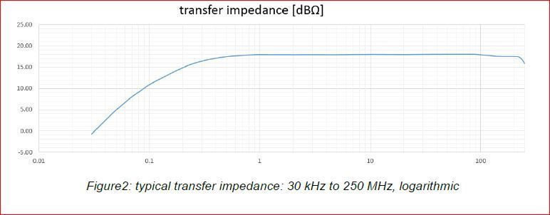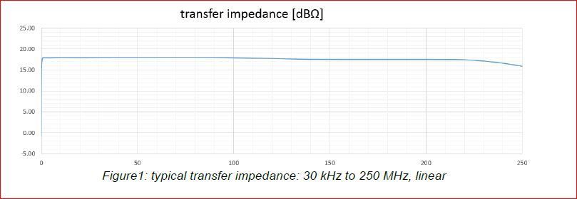 Die Sonde hat ein sehr flaches Ansprechverhalten mit einer 3dB Bandbreite von 250 MHz und ist über den Frequenzbereich von 30kHz bis 250 MHz charakterisiert und nutzbar. Die Apertur der HF-Stromüberwachungssonde beträgt 25 mm. Seine Übertragungsimpedanz beträgt > 16 dB Ohm im Bereich von 300 kHz bis 250 MHz Tekbox liefert eine Kalibriervorrichtung, die der TBCP1-Stromsondenserie entspricht.