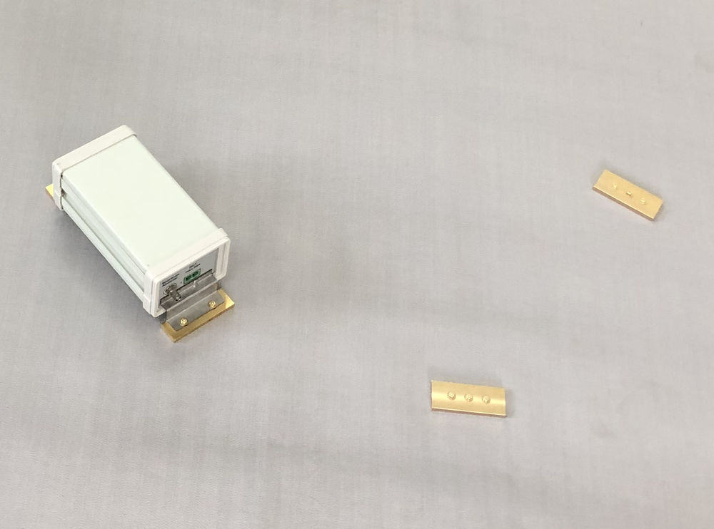 Mit der Ground Plane werden 4 massive Kontaktblöcke aus vernickeltem Messing mitgeliefert. Die Blöcke werden auf die Grundplatte aufgesetzt und stellen aufgrund ihres Gewichts von ca. 230g und ihrer Oberfläche einen guten elektrischen Kontakt her. Diese Methode ist sehr vielseitig, da die Blöcke überall auf der Massefläche leicht platziert und verschoben werden können. Der Abstand der Gewindebohrungen ist auf die Abmessungen der Massehalterungen der meisten Tekbox-LISNs abgestimmt. Zusätzlich ist jeder Block mit drei M5 Gewinden versehen, um konventionelle Erdungs-Bänder zu kontaktieren.