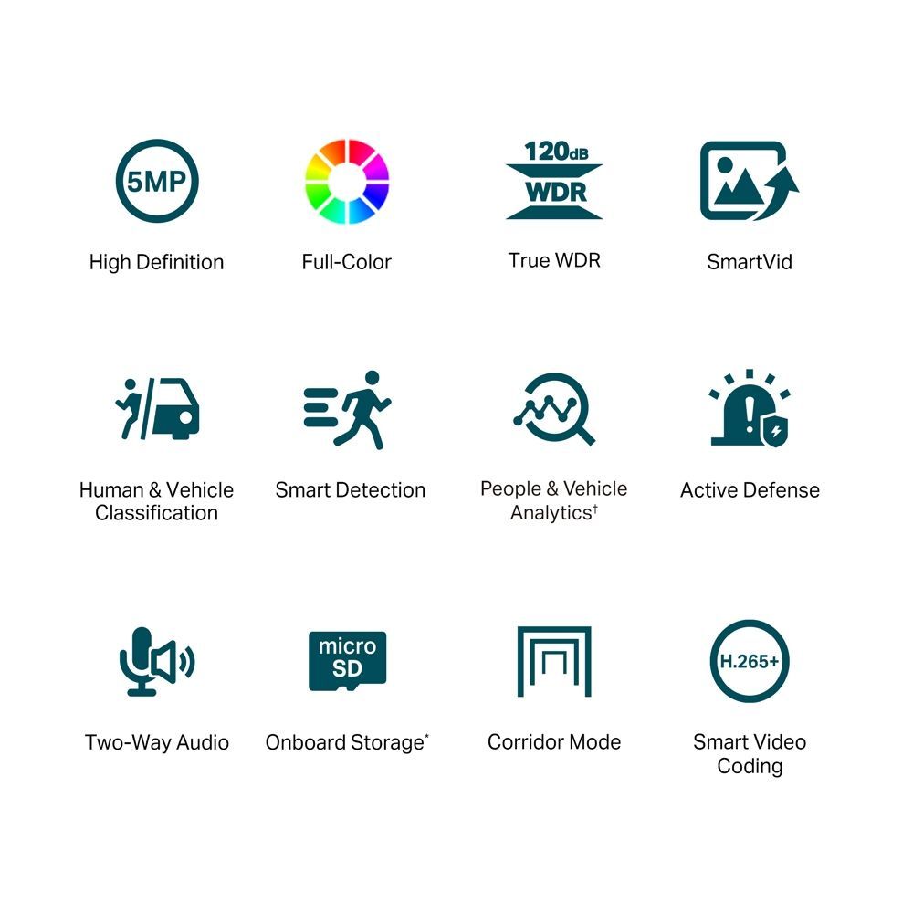 5MP Super-High Definition: The camera comes with 5MP–more than enough pixels to pick up some of the more discrete details. 24h Full-Color: Obtain 24-hour color details, even in pitch-black conditions, with its large-aperture lens, high-sensitivity sensor, and attached supplemental lights. Human < Vehicle Classification: Distinguishes humans and vehicles from other objects, so you receive more accurate event notifications. Smart Detection: Actively detects abnormal events like area intrusion and line-crossing, sending notifications to you instantly. People < Vehicle Analytics: Quickly find people and vehicles of interest using a series of attributes, allowing you to improve search efficiency. Active Defense: Warn potential intruders instantly with sound and light when abnormal events. Two-Way Audio: With voice intercom support, carry two-way conversations while watching your feed from anywhere. Corridor Mode: Allows you to change the image aspect ratio from 16:9 to 9:16, and helps to monitor long and narrow areas. H.265+: Without using any extra bandwidth, your cameras transmit compressed crystal-clear video to save disk space, ease network loads, and reduce monitoring costs without sacrificing image quality. Smart Video Enhancement: VIGI's professional technologies process videos to greatly improve their quality that is vital to your monitoring, including Smart IR, True WDR, 3D DNR, and Night Vision. PoE/12V DC: Two types of power supply not only give you more convenience but also make your wiring remarkably easy. Flexible Management and Storage: Take full control over your security via four management methods: the web UI, NVR UI, VIGI app, and VIGI Security Manager. Local storage is available for each method, as well as onboard storage with SD card slot (up to 256 GB).
