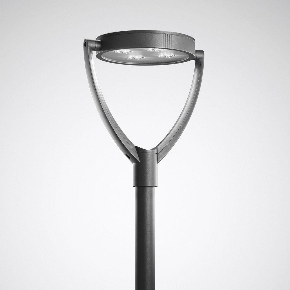 Dekorative Mastaufsatzleuchte mit planer Abdeckscheibe, Mastaufsatz parabolförmig. Mit intelligentem Label zum schnellen Aufrufen von Leuchten-Informationen mittels QR-Code. Mit Leistungsreduzierung über Steuerphase. Das Abschalten einer Steuerphase bewirkt eine Einstellung des Leuchtenlichtstroms auf 50 %. Mastaufsatzleuchte für Mastzopf Ø 76 mm, Die Mastbefestigung erfolgt mit zwei Befestigungsschrauben nach EN 60598-2-3 aus Edelstahl. Mittels separat zu bestellender Reduzierstücke auch zur Montage an Masten mit Zopf Ø 60 mm geeignet. Passender Mast auf Anfrage. Optisches System in Multi-Lens-Technologie (MLT) ausgeführt. Leuchtenoptik bestehend aus hocheffizienten, UV- und temperatur