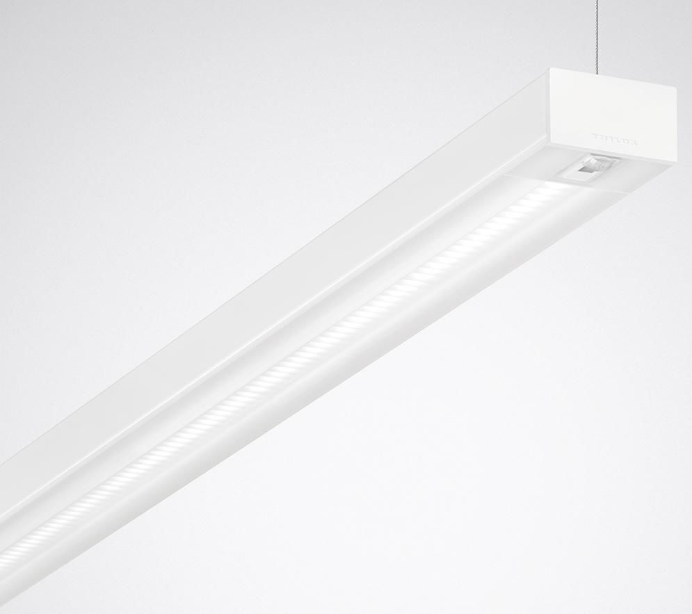 LED-Hängeleuchte für Einzel- oder Lichtbandanwendungen. Mit integriertem LiveLink Sensor zum Anschluss an ein LiveLink Steuergerät zur tageslichtabhängigen Regelung und Anwesenheitserfassung. LiveLink Sensor IR Micro zur tageslichtabhängigen Regelung und Anwesenheitserfassung. Konstantlichtregelung mit Abschaltfunktion bei ausreichendem Tageslicht. Passiv-Infrarot-Anwesenheitssensor, mit hochsensiblem multisegment Pyrosensoren, mit einstellbarer Ausschaltverzögerungszeit, wahlweise im Automatik Betrieb (automatisch Ein, automatisch Aus) oder Halbautomatik Betrieb (automatisch Aus, manuell Ein). Spezieller IQ-Modus zur automatischen Anpassung der Nachlaufzeit an die Raumnutzung. Elektrische Versorgung über die DALI Schnittstelle des Steuergerätes. Belegt 2 DALI Teilnehmer. Quadratische Erfassung, Erfassungsquadrate Präsenz max. 4 m x 4 m (16 m2) / Radial max. 4 m x 4 m (16 m2) / Tangential max. 6 m x 6 m (36 m2) bei einer empfohlenen Montagehöhe von 2,8 m, zulässige Montagehöhe 2,5 m bis 4 m. Für abgehängte Montage. Als Einzelleuchte oder in Lichtbandanwendung. Optisches System in Micro-Reflektor-Technology (MRWD) mit hocheffizienten, weiß-polierten Reflektorkammern aus Kunststoff mit Diffusorscheibe für ein gleichmäßig ausgeleuchtetet Lichtbild mit höchstem Sehkomfort. Mit zusätzlicher, im optischen System integrierten, klaren Abdeckscheibe für raumseitig flächenbündigen Abschluß und Schutz der LED. Dezente seitliche Lichtauskopplung über die gesamte Leuchtenlänge. Mit lambertscher Lichtstärkeverteilung. Blendungsbewertung nach UGR-Einstufung (EN 12464-1) 80. Farborttoleranz (initial MacAdam) = 3 SDCM. Mittlere Bemessungslebensdauer L80(tq 25 °C) = 50.000 h. Die Lichtquelle ist entsprechend der Ökodesign-Anforderungen (VO (EU) 2019/2020) austauschbar. Leuchtenkörper aus Stahlblech. Oberfläche weiß beschichtet (RAL 9016). Maße (L x B): 1473 mm x 84 mm, Leuchtenhöhe 45 mm. Zulässige Umgebungstemperatur (ta): -20 °C - +25 °C. Schutzklasse (EN 61140): I, Schutzart (DIN EN 60529):