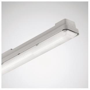 IP 66 für den Einsatz in Anwendungen mit hohen Anforderungen an Variabilität, Effizienz, Lichtqualität und Technik. Die Leuchte ist Bestandteil eines Sortiments mit baugleichen, montagetechnisch kompatiblen Varianten. Diese Varianten sind mit alternativen optischen Systemen, Light-Engines mit einstellbaren Lichtströmen sowie mit Anbindungsoption an Lichtmanagement- und Notbeleuchtungssysteme verfügbar. Geeignet zur Anwendung in HACCP, IFS und/oder BRC Global Standard Food zertifizierten Unternehmen. Mit begrenzter Oberflächentemperatur, für den Einsatz in feuergefährdeten Räumen gemäß DIN EN 60598-2-24 geeignet. Mit Cliplos-Verschlusstechnik zur schutzartgerechten, einfachen Montage von Diffusor-Abdeckwanne und Leuchtenkörper nach dem Anschluss. Abgehängte Montage über optionales Zubehör möglich. Deckenmontage über beiliegende Edelstahl-Befestigungsklammer. Abgehängte Montage über optionales Zubehör möglich. Mit einer prismierten, lichttechnisch wirksamen, transluzenten PC-Abdeckwanne, direkt strahlend. Mit symmetrisch eng strahlender Lichtstärkeverteilung. Leuchtenlichtstrom und Lichtfarbe fest eingestellt. Bemessungslichtstrom 6400 lm, Bemessungsleistung 43 W, maximale Leuchten-Lichtausbeute 149 lm/W. Lichtfarbe neutralweiß, ähnlichste Farbtemperatur (CCT) 4000 K, allgemeiner Farbwiedergabeindex (CRI) Ra > 80. Farborttoleranz (initial MacAdam) = 3 SDCM. Mittlere Bemessungslebensdauer L80(tq 25 °C) = 70.000 h, mittlere Bemessungslebensdauer L80(tq 35 °C) = 50.000 h. Die Lichtquelle ist entsprechend der Ökodesign-Anforderungen (VO (EU) 2019/2020) austauschbar. Leuchtenkörper aus PC. Leuchtenkörper Farbe lichtgrau (RAL 7035). Maße (L x B): 1552 mm x 102 mm, Leuchtenhöhe 91 mm. Zulässige Umgebungstemperatur (ta): -30 °C - +35 °C. Schutzklasse (EN 61140): I, Schutzart (DIN EN 60529):