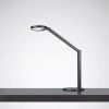 Kompakte Tischleuchte mit einem flachen, runden Leuchtenkopf, drei Justiergelenken und Standfuß. Die Steuerung der Leuchte erfolgt über die Bedienelemente am Leuchtenkopf. Geeignet zur Beleuchtung einer Fläche RF3 nach DIN 5035-8 mit bis zu 500lx ohne Zusatzbeleuchtung. In Verbindung mit Allgemeinbeleuchtung (500lx) werden für bürospezifische Sehaufgaben modifizierte Beleuchtungsstärken nach DIN EN 12464-1:2021 von bis zu 1000lx auf der Fläche RF3 erreicht. Mit Bodenplatte zum Aufstellen auf eine plane Oberfläche. Die Bodenplatte ist zum Schutz der Standfläche vollflächig mit Filz unterfüttert. Das Vertikalgelenk am Leuchtenfuß ermöglicht eine Drehung des Leuchtenkopfes um 120°. Mit prismierter Abdeckung für optimale Lichtverteilung. Mit asymmetrisch breit strahlender Lichtstärkeverteilung. Leuchtenlichtstrom und Lichtfarbe fest eingestellt. Bemessungslichtstrom 700 lm, Bemessungsleistung 7,7 W, maximale Leuchten-Lichtausbeute 91 lm/W. Lichtfarbe neutralweiß, ähnlichste Farbtemperatur (CCT) 4000 K, allgemeiner Farbwiedergabeindex (CRI) Ra > 90. Farborttoleranz (initial MacAdam) = 3 SDCM. Mittlere Bemessungslebensdauer L80(tq 25 °C) = 50.000 h. Die Lichtquelle ist entsprechend der Ökodesign-Anforderungen (VO (EU) 2019/2020) austauschbar. Leuchtenkörper aus Aluminium-Druckguss. Oberfläche schwarz beschichtet (RAL 9005). Maße der Bodenplatte: Ø 190 mm x 10 mm. Maße Leuchtenkopf Ø 134 mm x 23 mm, Leuchtenhöhe (stufenlos einstellbar) 390 mm - 715 mm. Schutzklasse (EN 61140): II, Schutzart (DIN EN 60529):