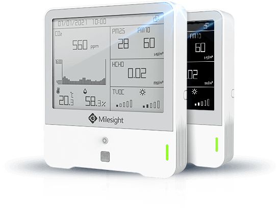 Temperatur, Luftfeuchtigkeit, Licht, CO2 und TVOC. Milesight IoT-Sensor zur Überwachung der Innenumgebung, AM307-868M / LoRaWAN / Temp. / Luftfeuchtigkeit / CO2 / PIR / Licht / TVOC / hPA / E-Ink-Anzeige