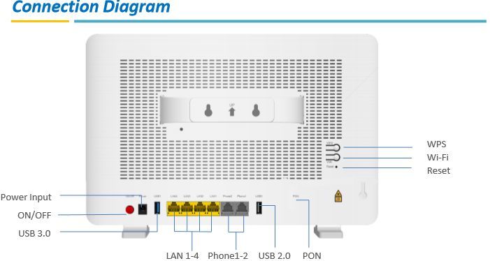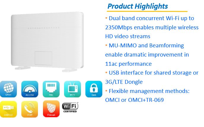 bull 1 SC/APC connector for GPON bull 4 RJ-45 ports for GE interface bull 2 RJ-11 ports for VoIP bull 2 USB ports (1x USB2.0, 1x USB 3.0)